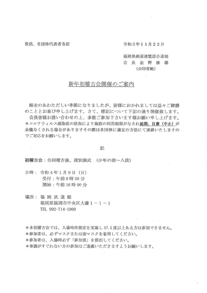 新年初稽古会開催のご案内 2021 12/14 お知らせ 稽古会 2021年12月14日 参加者確認表 お知らせ 稽古会 よかったらシェアしてね! URLをコピーしました! URLをコピーしました! 居合道だより185号 明けましておめでとうございます。居合道だより186号 この記事を書いた人 kozu 関連記事 香川県大会 2025年5月17日 第18回全国各流居合道さくらんぼ大会 2025年3月8日 全日本居合道大会の見学が可能となりました 2024年9月9日 強化委員会からのお知らせ 2023年6月6日 2023年度 居合道初心者体験教室のご案内 2023年5月30日 第56回福岡県居合道大会開催について 2023年5月28日 福岡県居合道部稽古会及び級審査、称号講習の開催 2022年11月5日 居合道初心者体験教室チラシ令和4年度版 2022年6月16日
