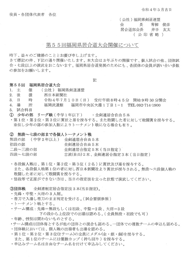 第55回居合道大会開催について 2022 6/10 お知らせ 大会 新着情報 2022年5月24日2022年6月10日 第55回居合道大会開催について 3年ぶりに居合道大会が開催される予定です。 楽しい大会になる様、皆様奮ってご参加ください。(写真クリックで詳細PDF) お知らせ 大会 新着情報 よかったらシェアしてね! URLをコピーしました! URLをコピーしました! 福岡県居合道講習会及び称号講習・級審査のお知らせ 居合道だより191号 この記事を書いた人 kozu 関連記事 居合道だより232号 2025年11月1日 福岡県居合道部稽古会及び級審査・称号講習の開催について 2025年10月8日 福岡県居合道地域稽古会の開催について 2025年10月8日 居合道だより231号 2025年10月1日 居合道八・七・六段審査会(修正) 2025年9月22日 居合道だより230号 2025年9月1日 小田信秋先生範士合格祝賀会 2025年8月6日 第60回全日本居合道大会 2025年8月4日