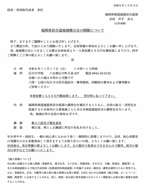 福岡県居合道地域稽古会について 2024 10/04 地域稽古会 新着情報 2024年10月4日 地域稽古会 新着情報 よかったらシェアしてね! URLをコピーしました! URLをコピーしました! 居合道だより219号 福岡県居合道稽古・称号講習・級審査会 この記事を書いた人 kozu 関連記事 居合道だより232号 2025年11月1日 福岡県居合道部稽古会及び級審査・称号講習の開催について 2025年10月8日 福岡県居合道地域稽古会の開催について 2025年10月8日 居合道だより231号 2025年10月1日 居合道八・七・六段審査会(修正) 2025年9月22日 居合道だより230号 2025年9月1日 小田信秋先生範士合格祝賀会 2025年8月6日 第60回全日本居合道大会 2025年8月4日