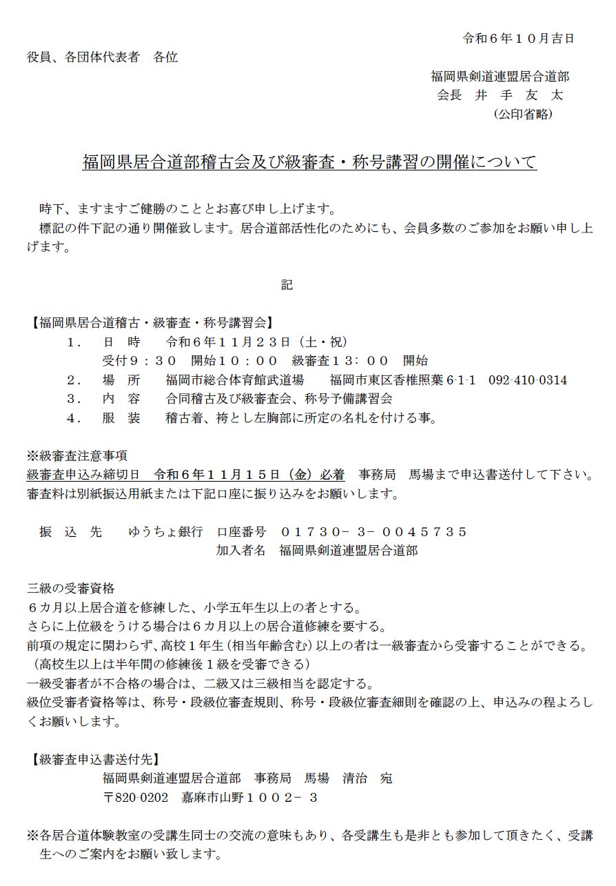 福岡県居合道稽古・称号講習・級審査会 2024 10/04 新着情報 2024年10月4日 Screenshot 新着情報 よかったらシェアしてね! URLをコピーしました! URLをコピーしました! 福岡県居合道地域稽古会について 居合道だより220号 この記事を書いた人 kozu 関連記事 居合道だより232号 2025年11月1日 福岡県居合道部稽古会及び級審査・称号講習の開催について 2025年10月8日 福岡県居合道地域稽古会の開催について 2025年10月8日 居合道だより231号 2025年10月1日 居合道八・七・六段審査会(修正) 2025年9月22日 居合道だより230号 2025年9月1日 小田信秋先生範士合格祝賀会 2025年8月6日 第60回全日本居合道大会 2025年8月4日