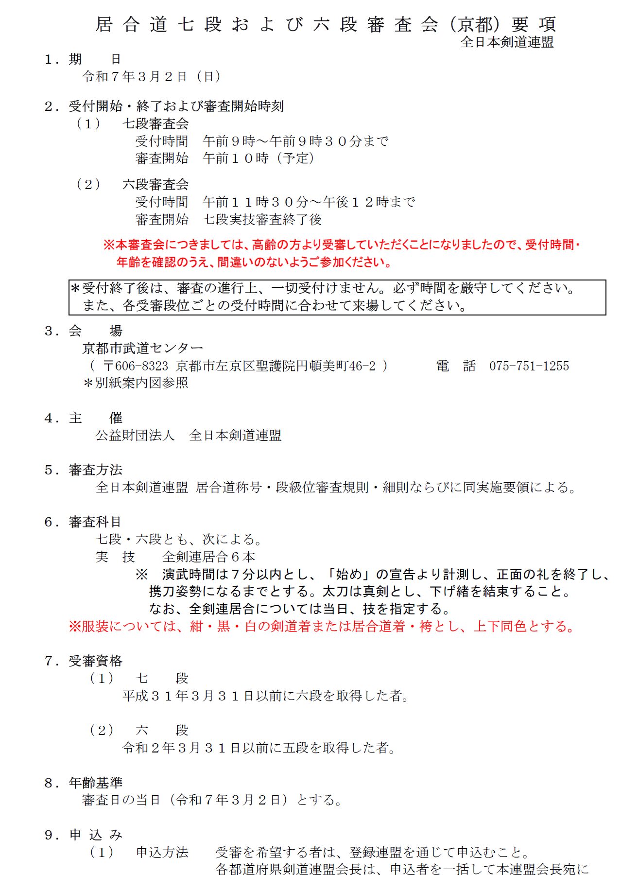 居 合 道 七 段 お よ び 六 段 審 査 会(京都)要 項 2024 12/07 新着情報 新着情報news 2024年12月7日 居 合 道 七 段 お よ び 六 段 審 査 会(京都)要 項PDF 新着情報 新着情報news よかったらシェアしてね! URLをコピーしました! URLをコピーしました! 新年初稽古会開催のご案内 令和7年1月、3月の地域稽古会 この記事を書いた人 kozu 関連記事 福岡県居合道部稽古会及び級審査・称号講習の開催について 2025年10月8日 福岡県居合道地域稽古会の開催について 2025年10月8日 居合道だより231号 2025年10月1日 居合道八・七・六段審査会(修正) 2025年9月22日 居合道だより230号 2025年9月1日 小田信秋先生範士合格祝賀会 2025年8月6日 第60回全日本居合道大会 2025年8月4日 居合道だより229号 2025年8月1日