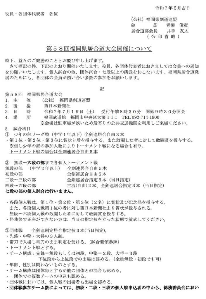 第58回福岡県居合道大会開催概要 2025 5/17 新着情報 2025年5月17日 大会概要と申込書(PDF) 新着情報 よかったらシェアしてね! URLをコピーしました! URLをコピーしました! 香川県大会 居合道初心者体験教室の内容 この記事を書いた人 kozu 関連記事 居合道七段および六段審査会(京都) 2025年12月10日 居合道地域稽古会のお知らせ 2025年12月2日 新年初稽古会開催のご案内 2025年12月2日 居合道だより233号 2025年12月1日 居合道だより232号 2025年11月1日 福岡県居合道部稽古会及び級審査・称号講習の開催について 2025年10月8日 福岡県居合道地域稽古会の開催について 2025年10月8日 居合道だより231号 2025年10月1日