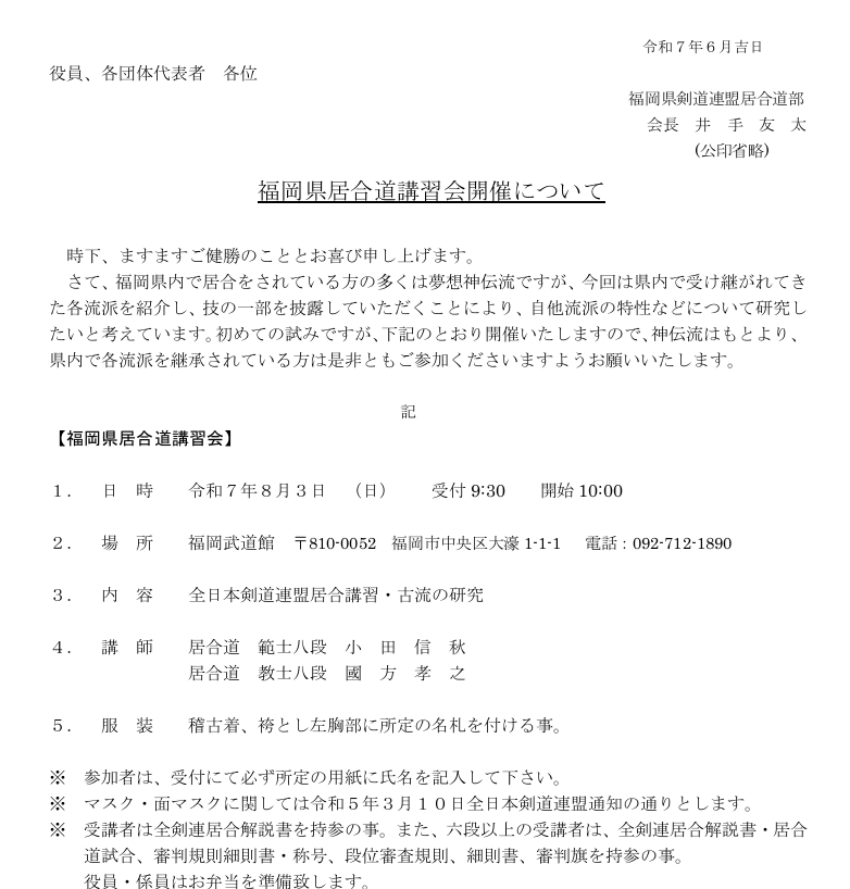 福岡県居合道講習会開催についておよび小田先生祝賀会申込書 2025 6/09 新着情報 2025年6月9日 小田先生祝賀会申し込み用紙はこちら 新着情報 よかったらシェアしてね! URLをコピーしました! URLをコピーしました! 居合道だより227号 第58回福岡県居合道大会開催について この記事を書いた人 kozu 関連記事 居合道だより232号 2025年11月1日 福岡県居合道部稽古会及び級審査・称号講習の開催について 2025年10月8日 福岡県居合道地域稽古会の開催について 2025年10月8日 居合道だより231号 2025年10月1日 居合道八・七・六段審査会(修正) 2025年9月22日 居合道だより230号 2025年9月1日 小田信秋先生範士合格祝賀会 2025年8月6日 第60回全日本居合道大会 2025年8月4日