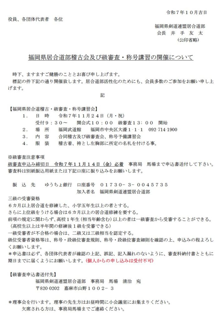 福岡県居合道部稽古会及び級審査・称号講習の開催について 2025 10/08 新着情報 2025年10月8日 福岡県居合道部稽古会及び級審査・称号講習の開催について 新着情報 よかったらシェアしてね! URLをコピーしました! URLをコピーしました! 福岡県居合道地域稽古会の開催について 居合道だより232号 この記事を書いた人 kozu 関連記事 居合道だより232号 2025年11月1日 福岡県居合道地域稽古会の開催について 2025年10月8日 居合道だより231号 2025年10月1日 居合道八・七・六段審査会(修正) 2025年9月22日 居合道だより230号 2025年9月1日 小田信秋先生範士合格祝賀会 2025年8月6日 第60回全日本居合道大会 2025年8月4日 居合道だより229号 2025年8月1日