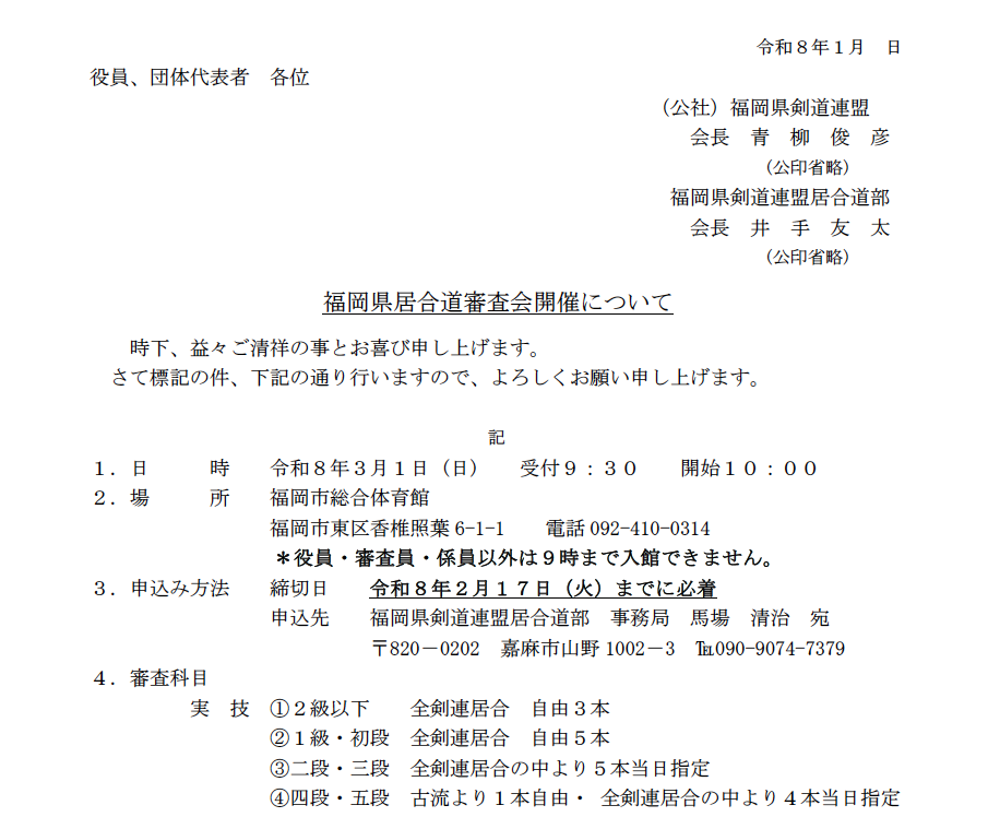 審査会案内 2026 1/19 新着情報 2026年1月19日 目次3月1日福岡県居合道審査会 新着情報 よかったらシェアしてね! URLをコピーしました! URLをコピーしました! 居合道だより234号 第122回全日本剣道演武大会要綱 この記事を書いた人 kozu 関連記事 居合道八段審査要項 2026年1月21日 第122回全日本剣道演武大会要綱 2026年1月19日 居合道だより234号 2026年1月1日 居合道七段および六段審査会(京都) 2025年12月10日 居合道地域稽古会のお知らせ 2025年12月2日 新年初稽古会開催のご案内 2025年12月2日 居合道だより233号 2025年12月1日 居合道だより232号 2025年11月1日